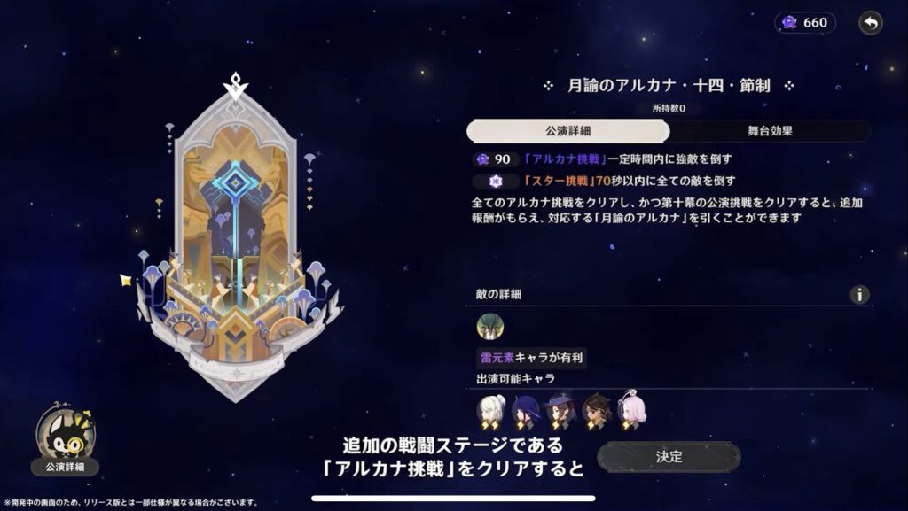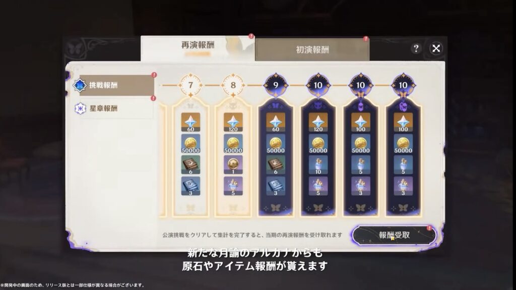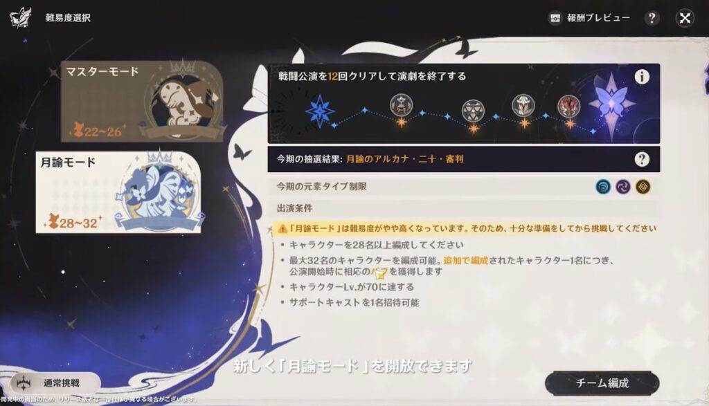 幻想シアターはVer.4.7で実装された常設の戦闘コンテンツです。決められた「指定元素」のキャラを編成し、幕ごとの挑戦を進めていく形式で、各幕の条件を満たすことで星章や軌跡の鍵を獲得できます。Ver.6.0の10月から最高難易度「月諭モード」が追加され、さらに挑戦要素が広がります。