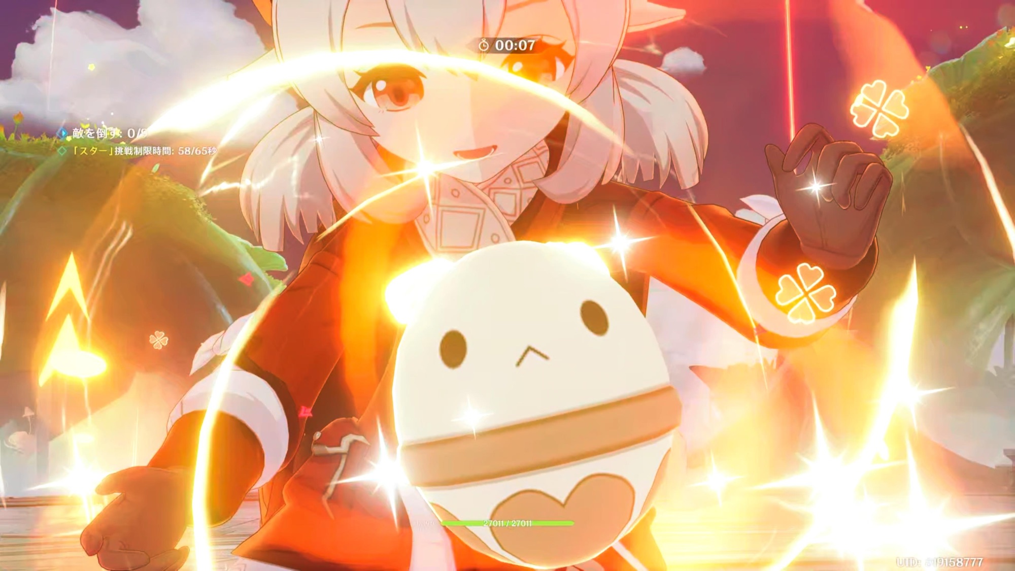 1凸攻撃やスキル発動時、一定の確率で花火を召喚して敵を攻撃し、元素爆発の攻撃力120%分の炎元素ダメージを与える。この効果が発動した後12秒間、クレーの攻撃力が+60%。