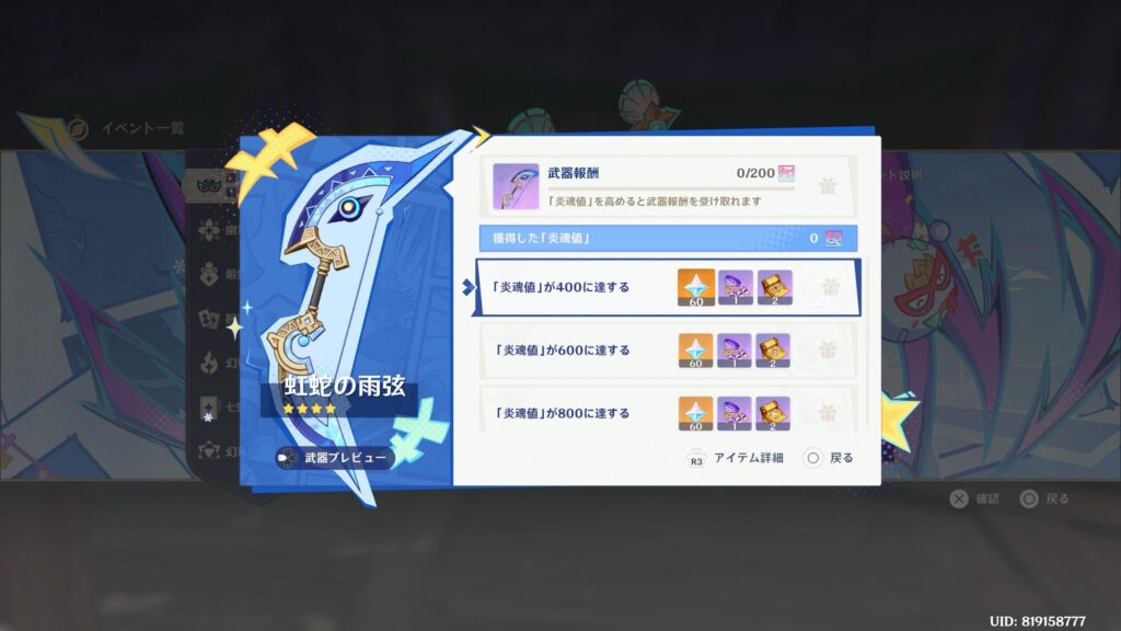 - 主な報酬:原石/イベント限定★4武器「弓・虹蛇の雨弦」/知恵の冠/武器の精錬素材 など