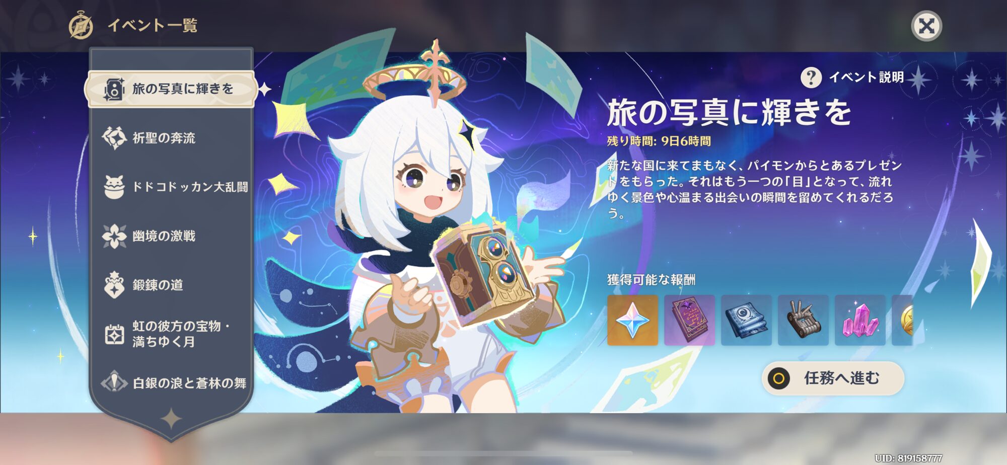 このイベントでは、パイモンの案内で世界任務「記憶を残すプレゼント」を進め、専用アイテム「メメント写真機」を入手します。