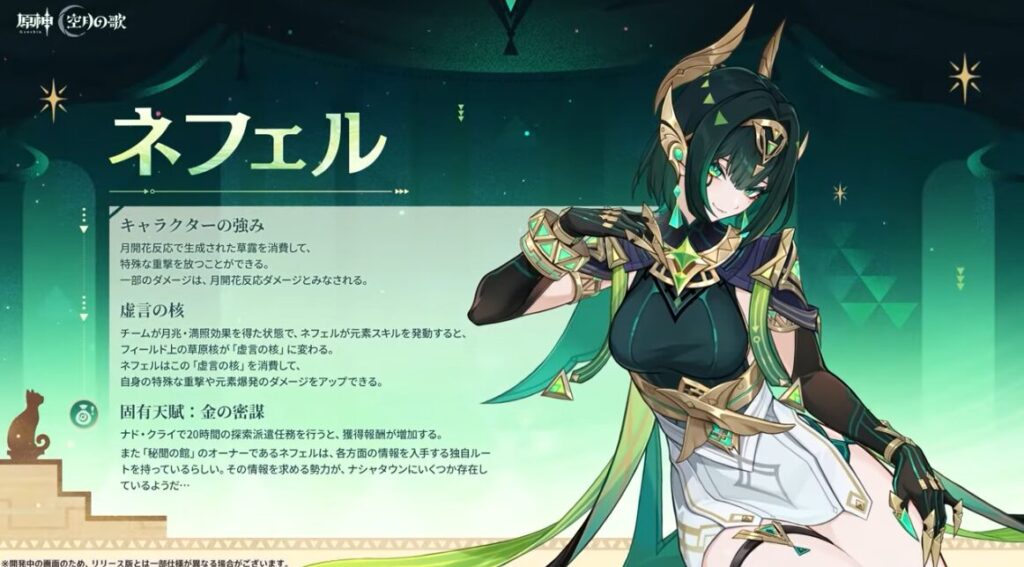 ネフェルは、草元素の法器キャラクターとして登場。「虚言の核」を重撃で消費し、攻撃を行う月開花系アタッカーです。