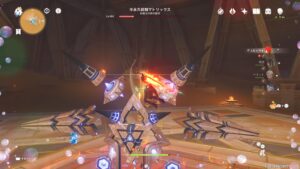 炎元素・両手剣。スキルで展開する炎領域が被ダメージを肩代わりし一定時間の完全中断耐性を付与。パーティ全体の安定性を高めます。爆発中は連続攻撃が可能ですが、火力は控えめなので裏からの元素付着や耐久補助の役割で起用することが多いです。