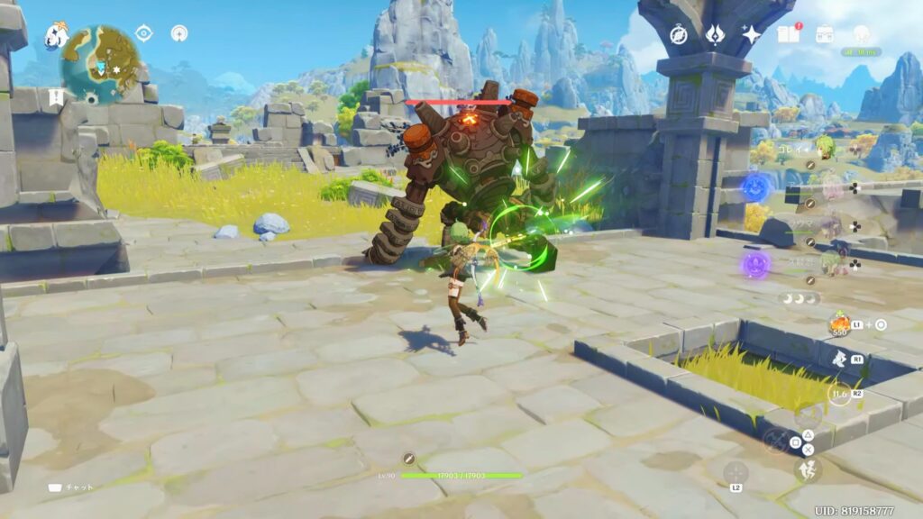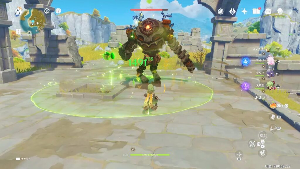 まずは味方の設置スキル(フィッシュルのオズや行秋の剣雨など)を展開したあと、コレイの元素爆発「ニャンコトレジャー」を発動します。